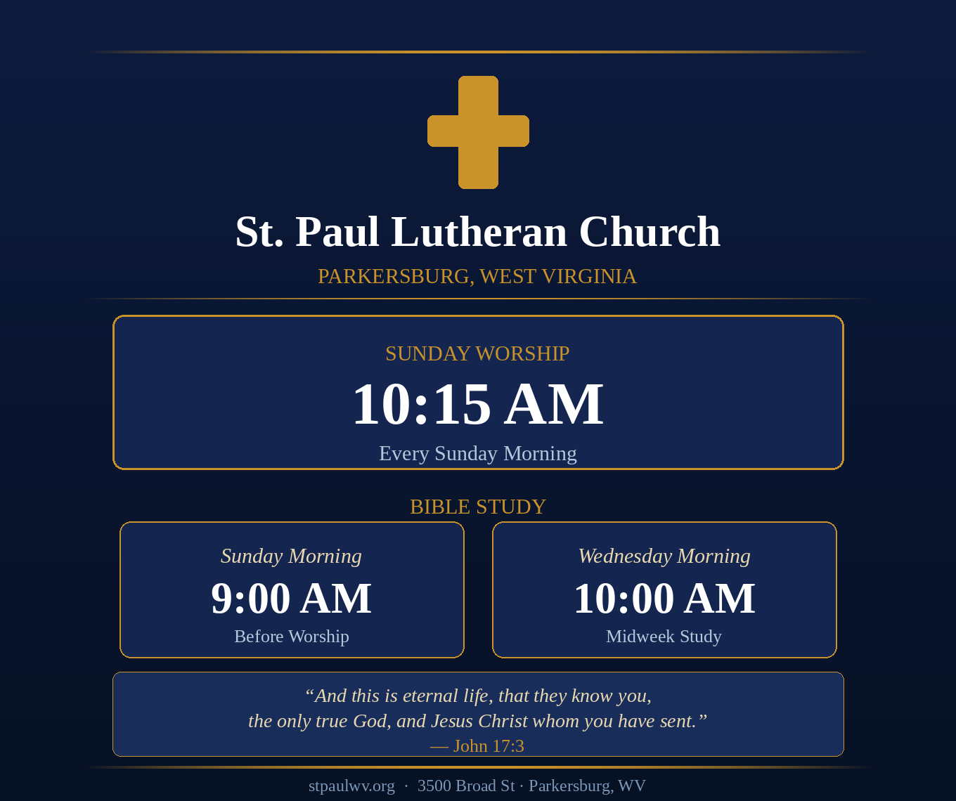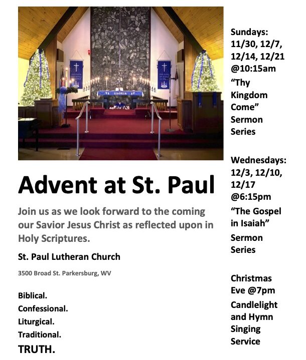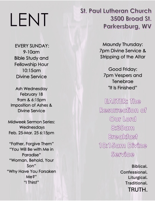 Adult Bible Class & Sunday School – Sunday 9:00am Weekly Bible Study – Wednesday 10:00am Confirmation & Membership for all ages. Instruction based on Luthers Small Chatechism – Contact the office to schedule a time convenient for you. Various Active Groups : Handbell Choir, Social Ministries, Youth Group, Evangelism, Stweardship, Monthly Mens Breakfast, Monthly Fellowship Lunch, Women’s Missionary League, Summer VBS, & More
